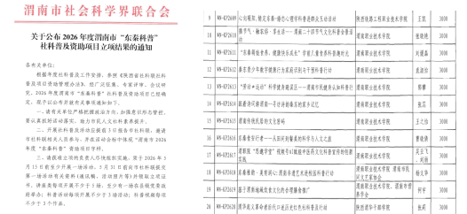 近日,渭南市社会科学界联合会公布2026年度渭南市“东秦科普”社科普及资助项目,我校10项项目获批立项,获批资助资金3万元。